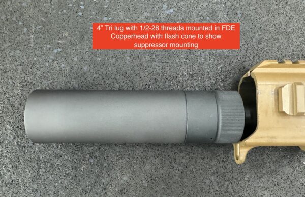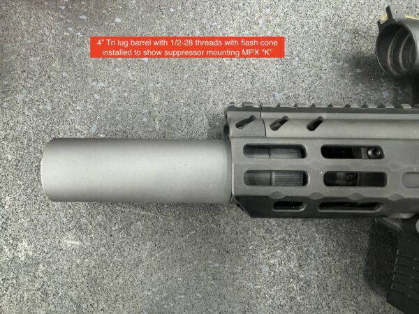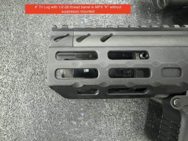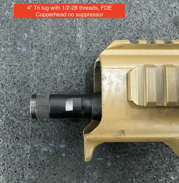 Designed specifically for the First Generation Copperhead (FDE Variant with no threaded barrel) but will work in all other Gen II/III MPX excluding Copperhead K. This is the shortest barrel I offer that allows use of the threads and Tri Lug to get most compact overall length. Barrels have a Tri Lug machined into barrel stock as well as 1/2-28 threads with thread protector. If Tri Lug is to be used thread protector should be left installed to aid in stabilizing the suppressor.